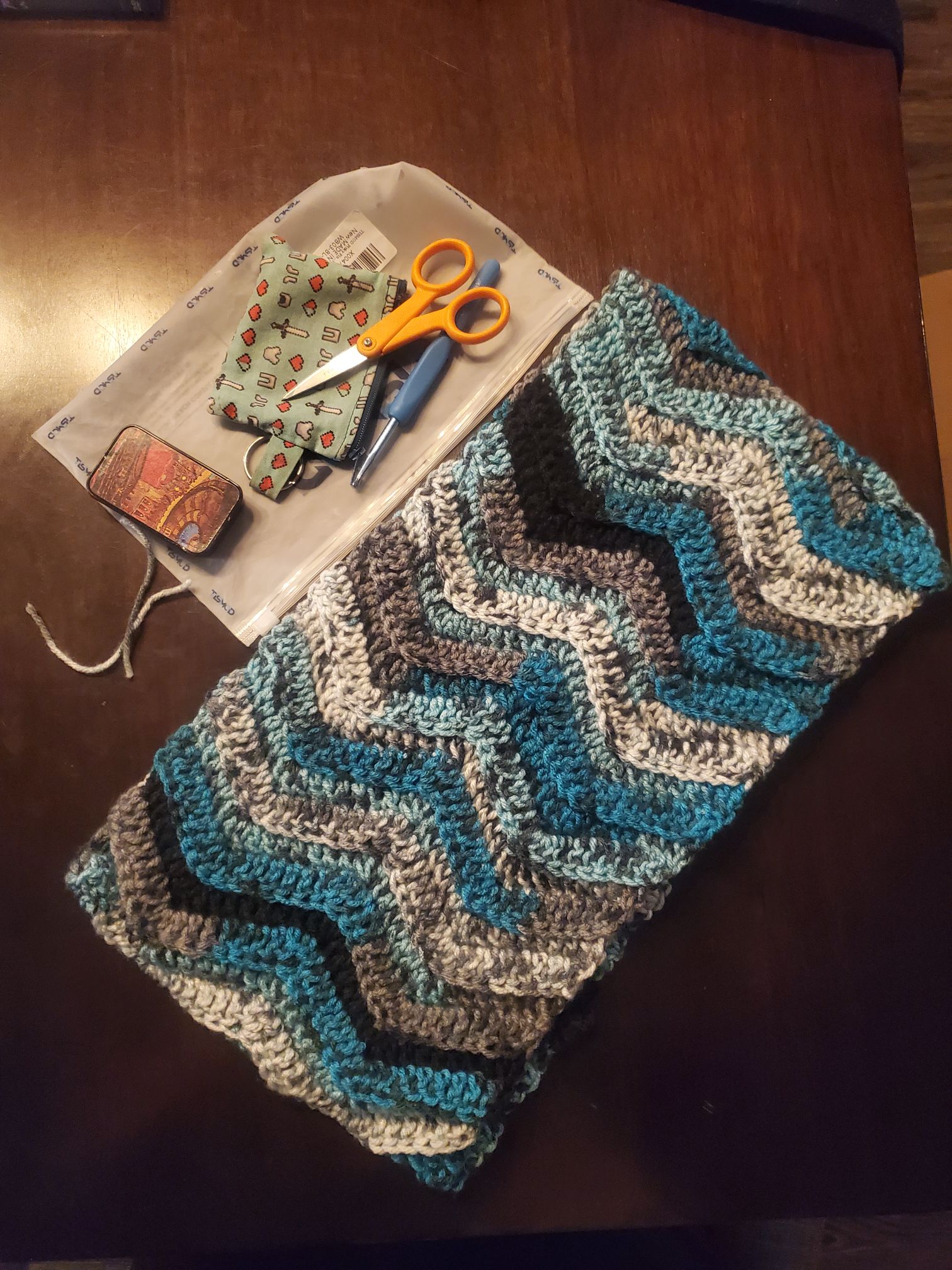 On the right is a scarf I made to use a skein of yarn my cats had unraveled. The pattern ended up being more beautiful than expected, and I thought it would be perfect for my SIL (it even matched her blue hair.) She loved it so I was happy it found a home.