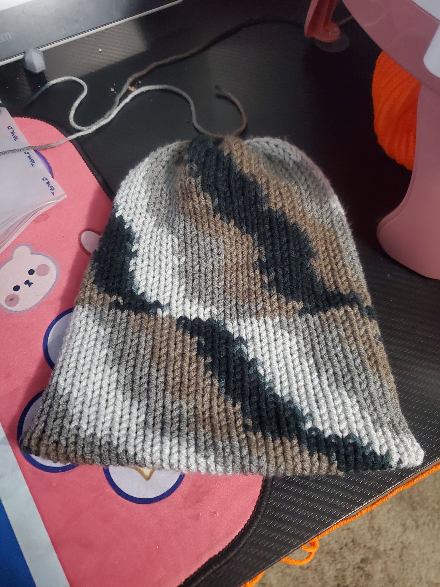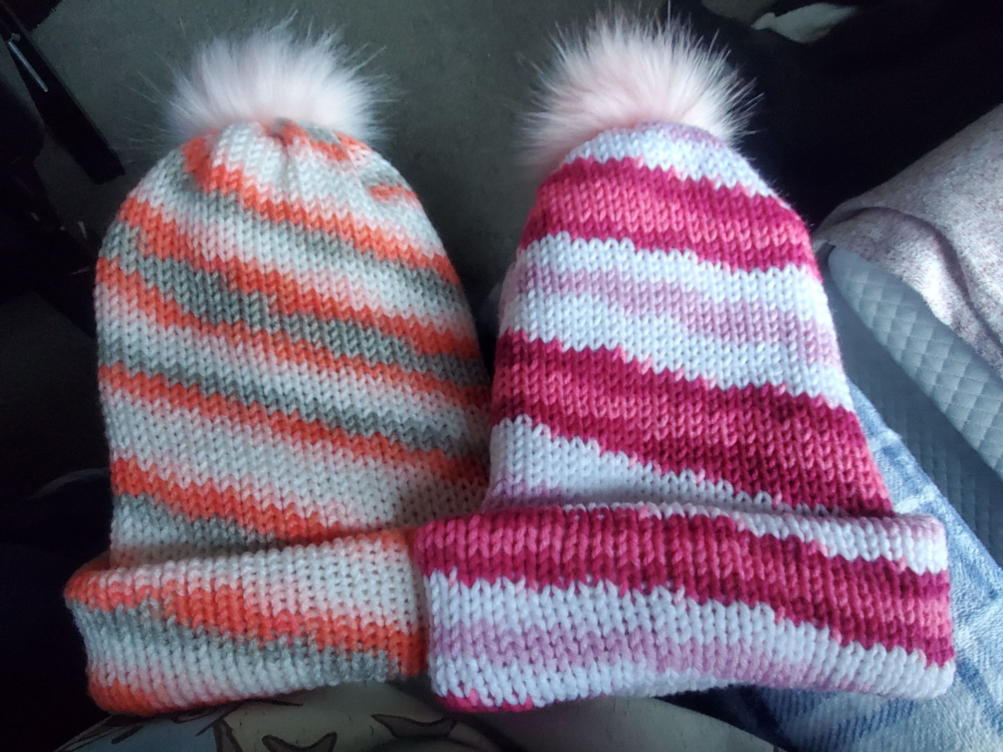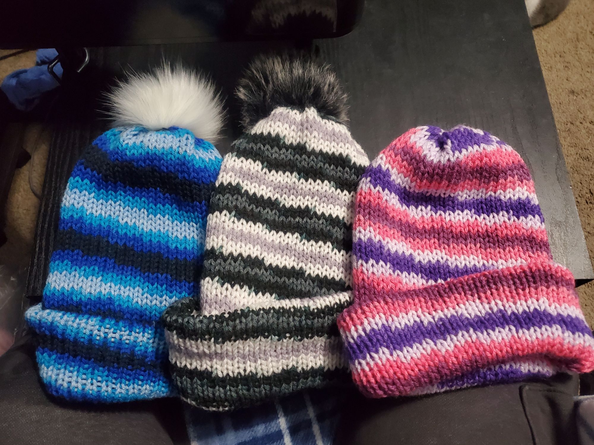These are just a handful of beanies I have made (I have made at least 20+ since I received my machine.) The first two pictures were testing out patterns a.k.a. how variegated yarns would turn out. I couldn’t have anticipated how beautiful they are! The spiral pattern is just superb!